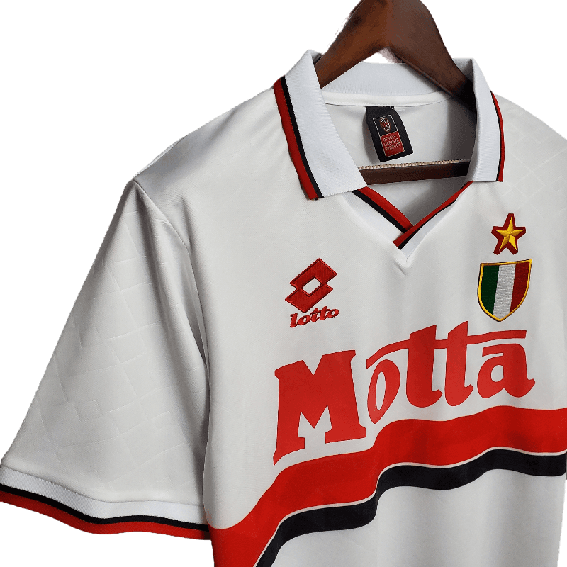 The AC Milan 1993/1994 Away Jersey is an iconic piece of football history, worn during one of the Rossoneri’s most dominant seasons. Featuring a clean white design with bold red and black details, this jersey was on display as Milan conquered both Serie A and the UEFA Champions League, cementing their status among Europe’s greatest clubs.