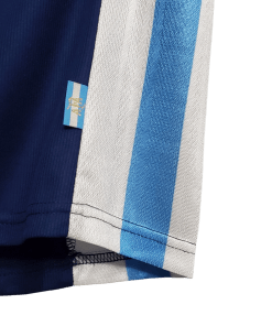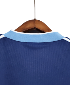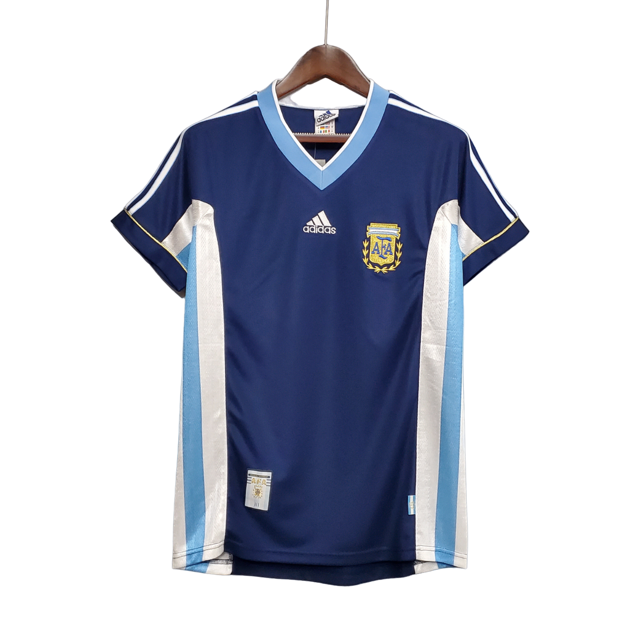 The Argentina 1998 Retro Away Jersey brings back memories of La Albiceleste’s thrilling run in the FIFA World Cup in France. Featuring a striking navy blue design with white and sky blue accents, this jersey was worn during key matches as Argentina battled some of the world’s best teams. A must-have for fans who appreciate the golden era of Argentine football.