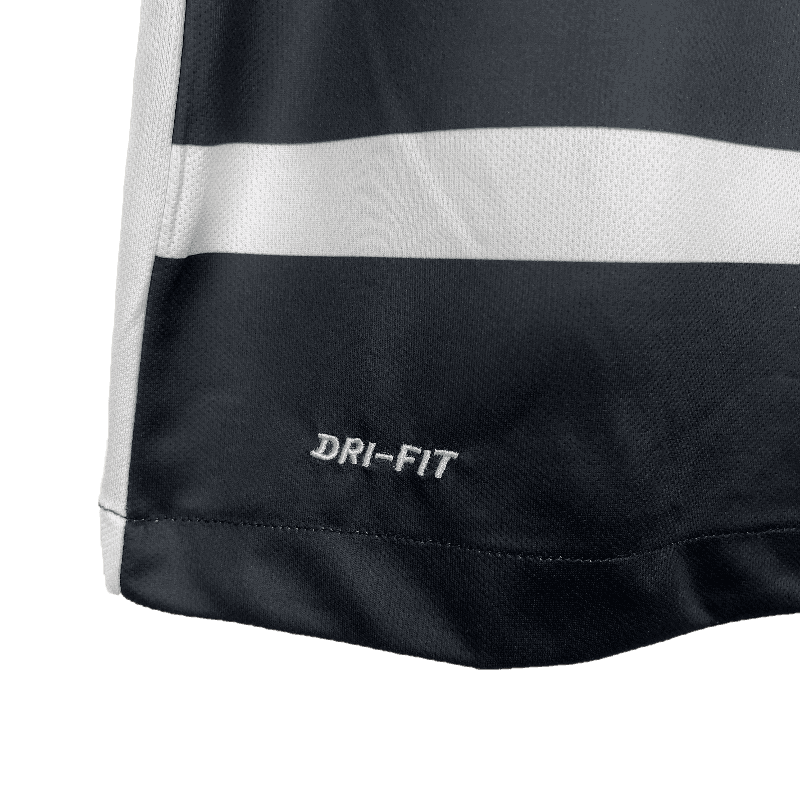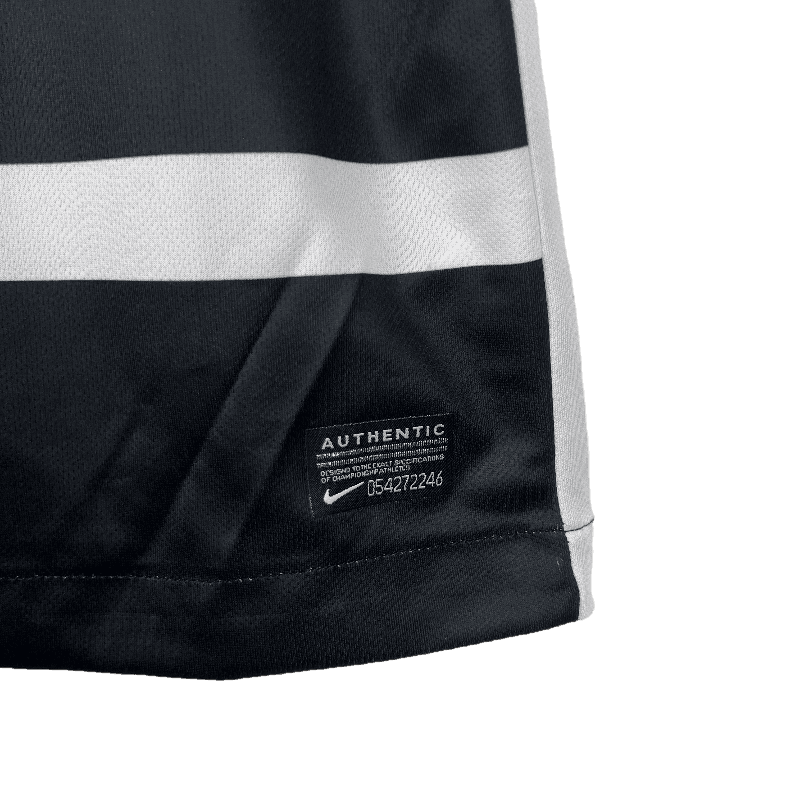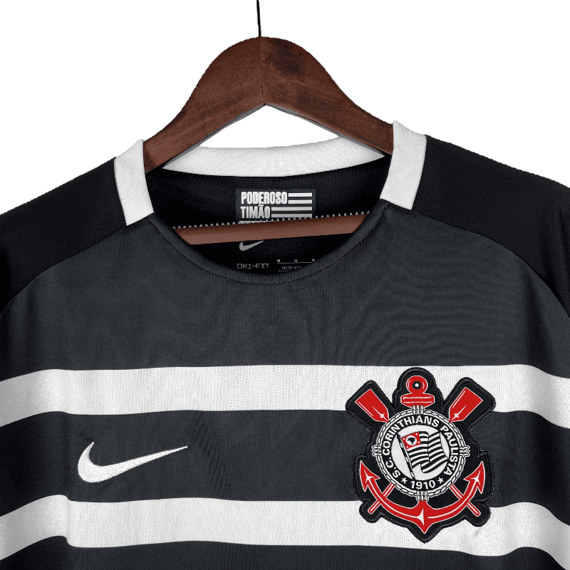 The Corinthians 2015/2016 Away jersey is a tribute to one of the club’s most dominant seasons in history. Featuring the iconic black design with bold white vertical stripes, this jersey represents the relentless spirit of the Timão during their triumphant 2015 Brasileirão campaign. Crafted for both comfort and style, it’s a must-have for fans who want to relive the club’s golden moments.