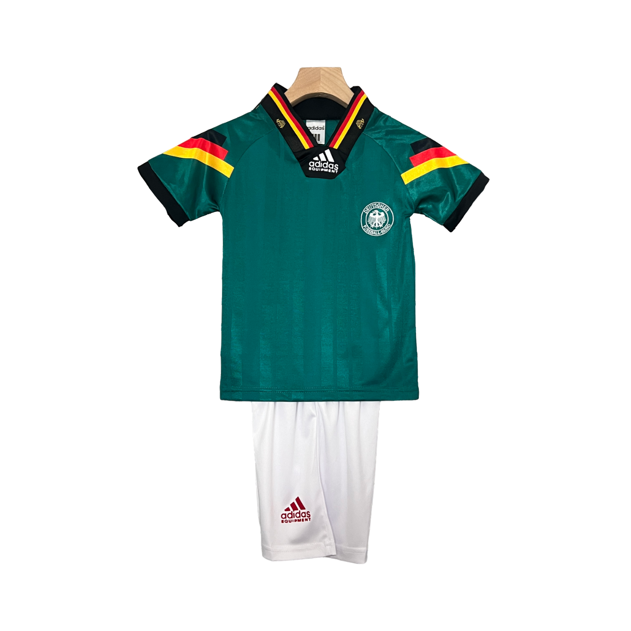 The Germany 1992 Away Jersey is a bold and memorable design, featuring a striking green base with the iconic black, red, and gold geometric pattern across the chest. Worn during the UEFA Euro 1992 tournament, where Germany reached the final, this jersey represents the nation’s footballing excellence. Designed for young fans, it’s the perfect way for kids to celebrate Die Mannschaft’s rich history.