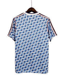 The Manchester United 1990/1992 Retro Away jersey is a standout design from the early years of Sir Alex Ferguson’s reign. Featuring a striking blue-and-white geometric pattern with a bold collar, this jersey was worn as the Red Devils lifted silverware and laid the groundwork for future success.