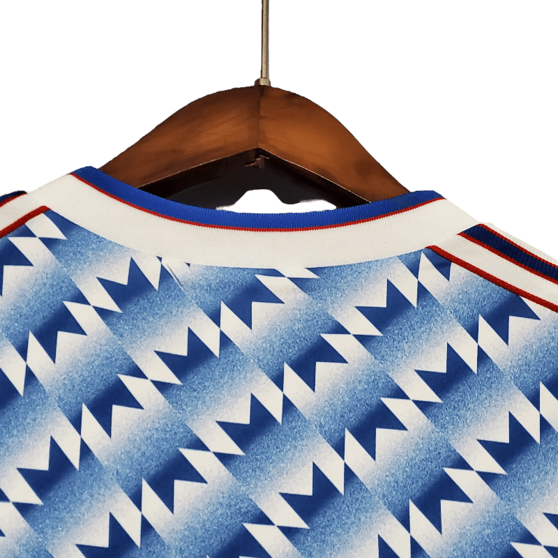 The Manchester United 1990/1992 Retro Away jersey is a standout design from the early years of Sir Alex Ferguson’s reign. Featuring a striking blue-and-white geometric pattern with a bold collar, this jersey was worn as the Red Devils lifted silverware and laid the groundwork for future success.