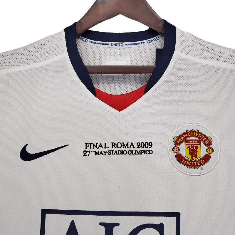 The Manchester United 2008/2009 Retro Champions League Away jersey is a tribute to a historic season in which the Red Devils aimed to defend their European crown. Featuring a clean white design with blue and red accents, this jersey was worn in crucial away matches, including the UEFA Champions League knockout stages. It remains an iconic kit from an era of dominance under Sir Alex Ferguson.