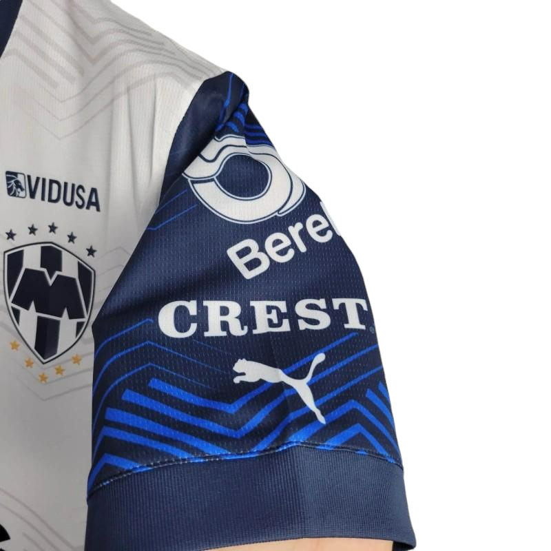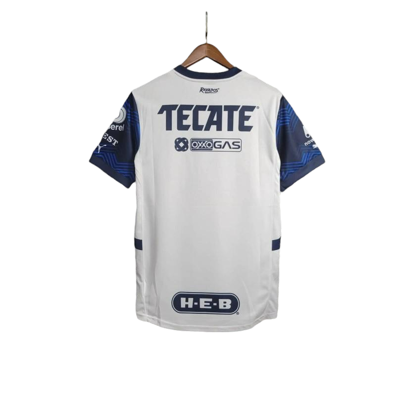 The Monterrey 2024/2025 Away Jersey features a sleek white base with striking horizontal patterns and bold navy accents, reflecting the club’s modern style and rich heritage. Designed for both performance and comfort, this jersey is perfect for fans supporting Los Rayados during their Liga MX and CONCACAF Champions Cup campaigns.