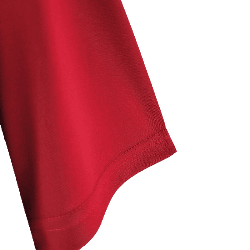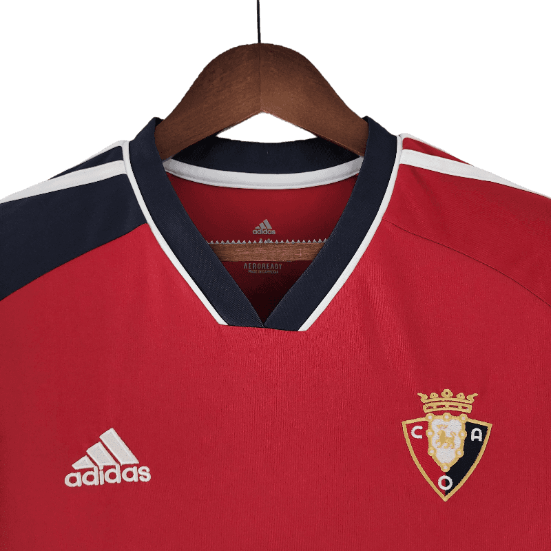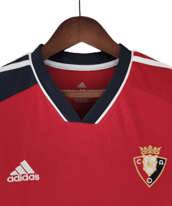 The Osasuna 2022/2023 Home Jersey showcases the club’s traditional red base, complemented by navy raglan-style sleeves and a navy V-neck with white trim. White sponsor logos and the iconic three stripes on the shoulders complete the design, reflecting the team’s rich heritage and pride.