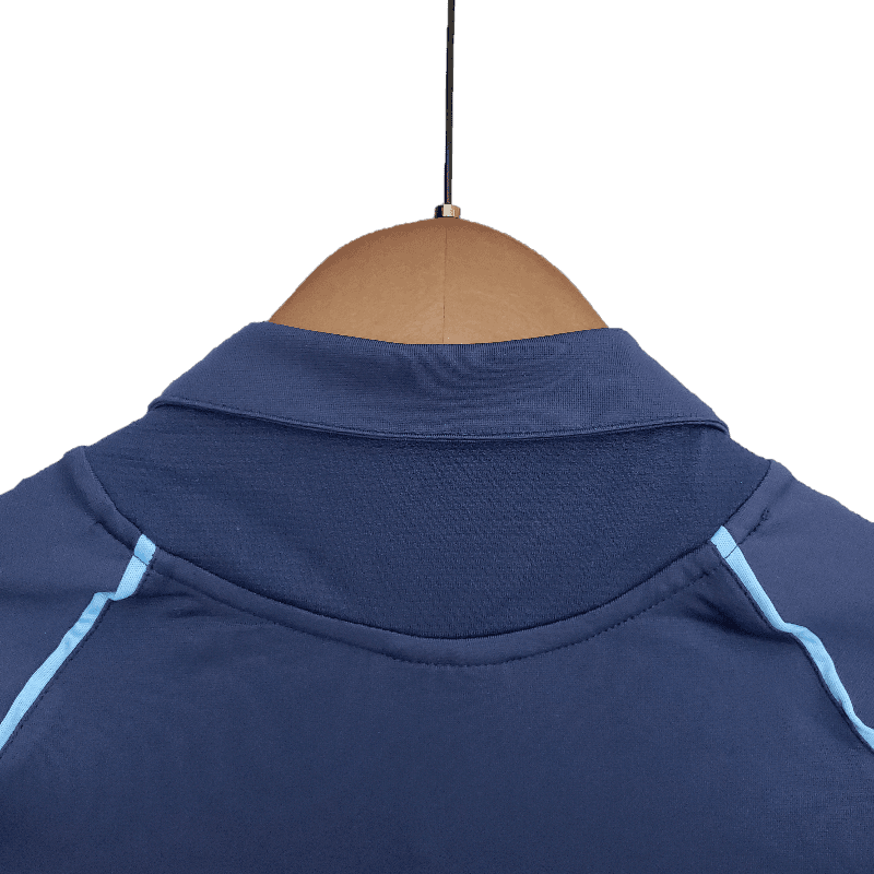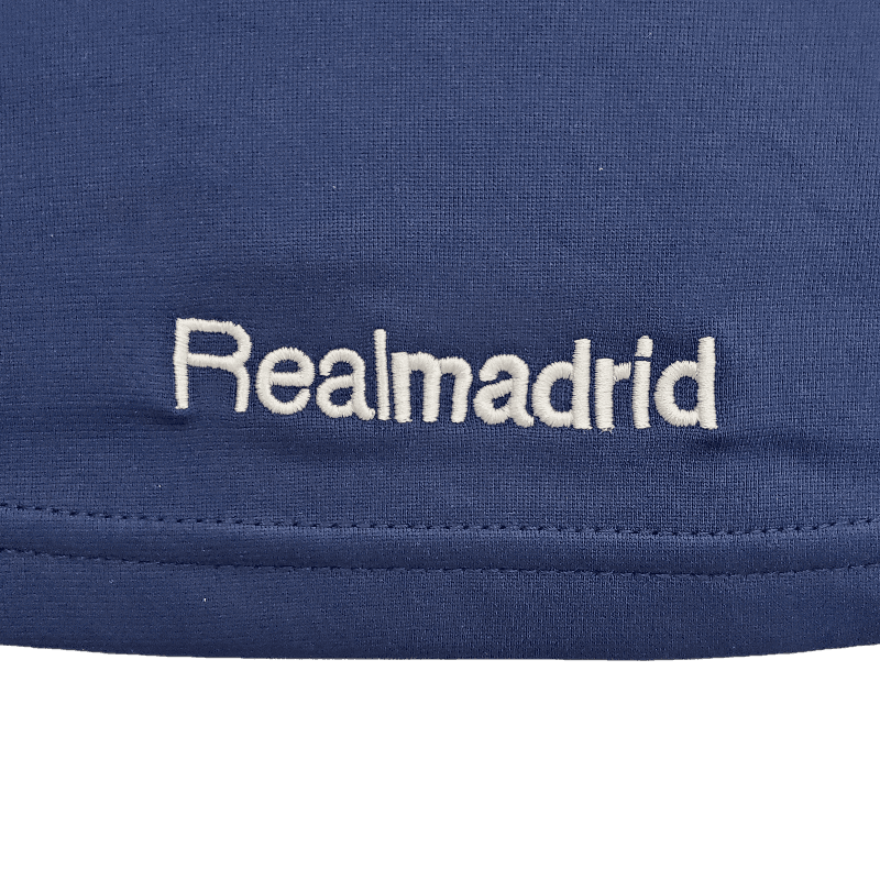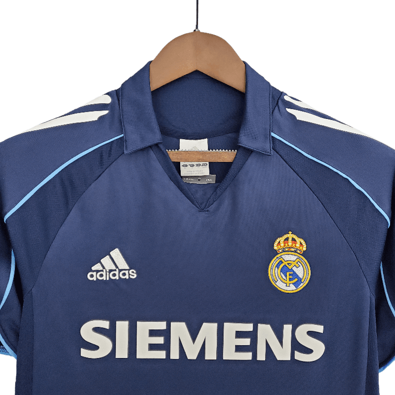 The Real Madrid 2005/2006 Away Jersey represents an era of star-studded football, featuring a sleek deep navy design with silver accents. Worn during key away matches in La Liga and the UEFA Champions League, this jersey captures the elegance and attacking style of the Galácticos era.