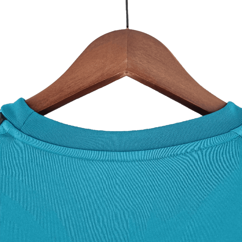 The Real Madrid 2017/2018 Third Jersey is a symbol of European dominance, marking the club’s historic third consecutive UEFA Champions League triumph. Featuring a sleek black design with teal accents, this long-sleeve edition adds a touch of elegance while celebrating a season filled with unforgettable moments and legendary performances.