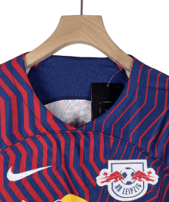 The Red Bull Leipzig 2023/2024 Kids Away Jersey showcases a sleek and modern design, featuring a striking dark base with dynamic red and white accents. Worn during their Bundesliga and European campaign, this jersey reflects the club’s ambition and fast-paced style of play.