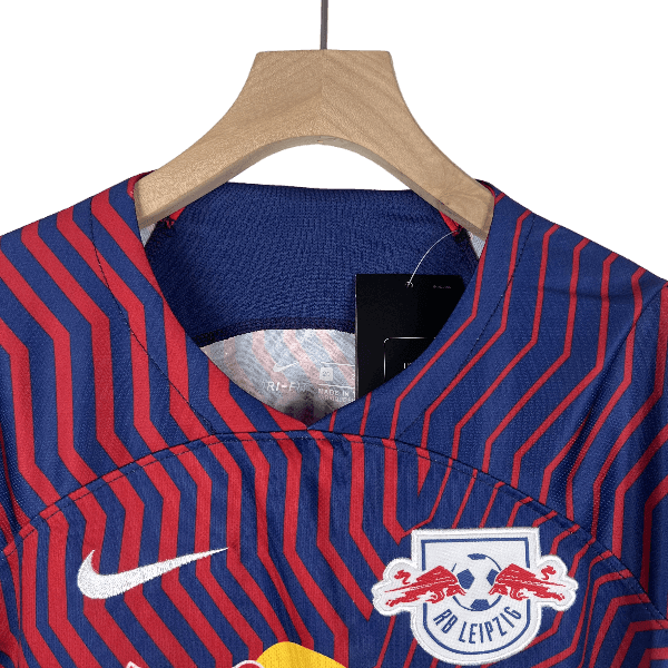 The Red Bull Leipzig 2023/2024 Kids Away Jersey showcases a sleek and modern design, featuring a striking dark base with dynamic red and white accents. Worn during their Bundesliga and European campaign, this jersey reflects the club’s ambition and fast-paced style of play.