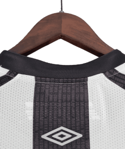 The Santos 2022/2023 Away Jersey introduces a striking design with bold black and white vertical stripes, accented by gold trims that add a touch of elegance. This jersey features the club’s crest prominently on the chest, symbolizing pride and tradition. Crafted from high-quality materials, it ensures comfort and durability, making it perfect for both match days and casual wear.