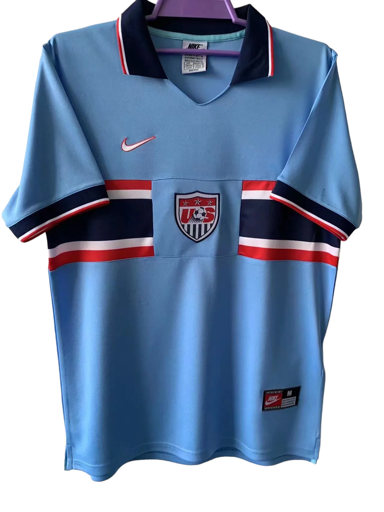 Relive a golden era of American soccer with the United States Retro 1995-97 Third Blue jersey. This iconic jersey pays homage to the US national team’s historic moments from the mid-90s, a time when American soccer captured the hearts of fans worldwide. Featuring a striking blue design with classic details, this jersey is a true collector’s item for enthusiasts of the sport. The nostalgic crest proudly displayed on the chest transports fans back to the glory days of US soccer, symbolizing the team’s journey and achievements. Crafted with premium materials for comfort and durability, this jersey is perfect for displaying your pride on match days or as a stylish addition to your everyday wardrobe. Join the legacy of American soccer and honor the Stars and Stripes with the United States Retro 1995-97 Third Blue jersey.